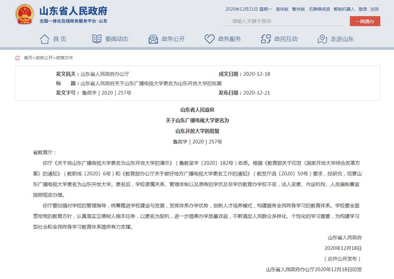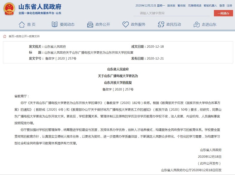 12月18日,山东省人民政府批复同意山东广播电视大学更名为山东开放大学。更名后,学校隶属关系、管理体制以及原有的学历及非学历教育办学权不变,法人变更、内设机构、人员编制事宜按照规定办理。(撰稿:董美华 审核:殷炳芳)