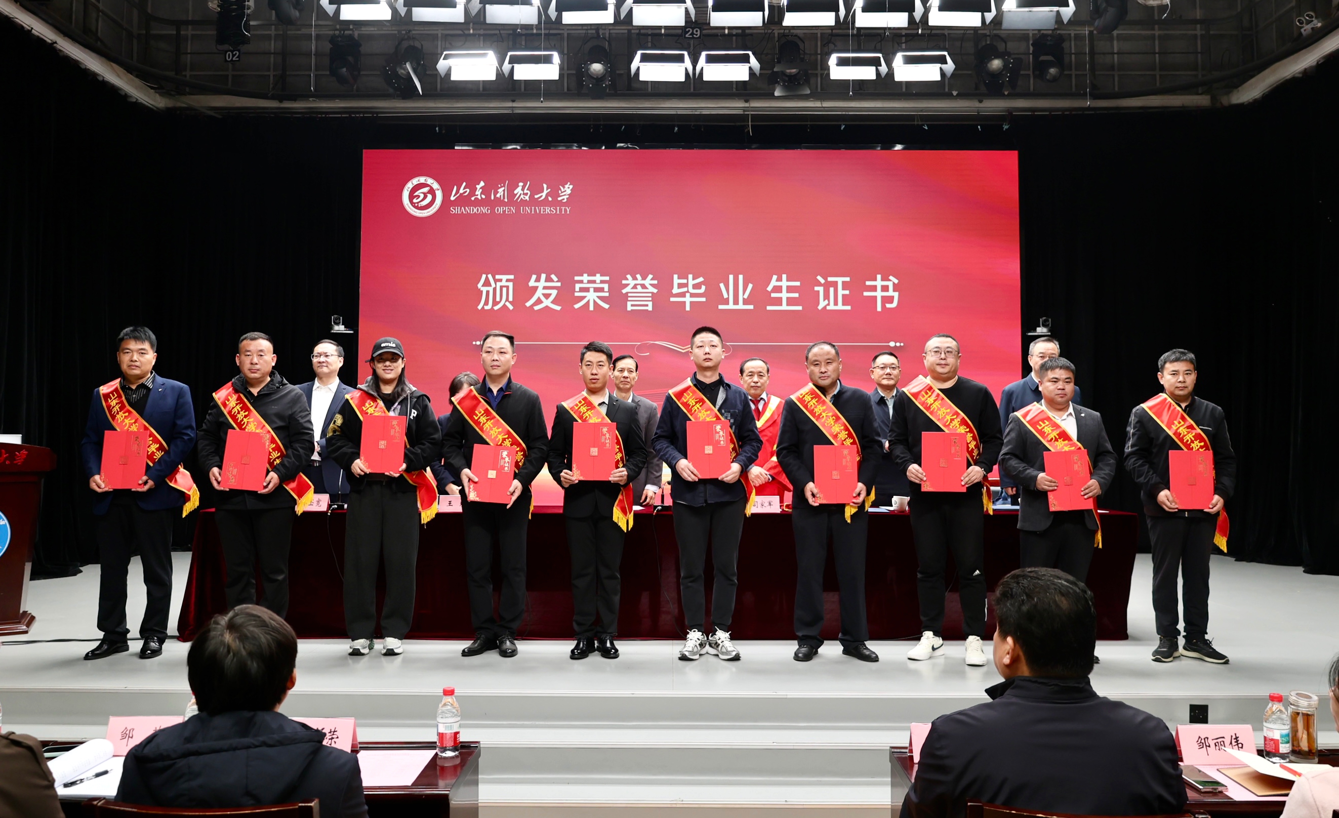 9时,典礼正式开始。全体起立,奏唱中华人民共和国国歌。王瑛宣读了《山东开放大学关于表彰2024年度开放教育荣誉毕业生的决定》。吕文波宣读了《国家开放大学关于授予5765名本科毕业生学士学位的决定》《关于公布国家开放大学2025年优秀学位论文评选结果的通知》,其中山东开放大学135名学生荣获学士学位称号、4名学生论文获评国家开放大学优秀学位论文、4名指导教师获评国家开放大学优秀论文指导教师。随后,全体校领导分别为荣誉毕业生颁发证书,为毕业生代表颁发毕业证书。司家军为获得学士学位的学生代表执拨穗礼,并颁发学位证书。