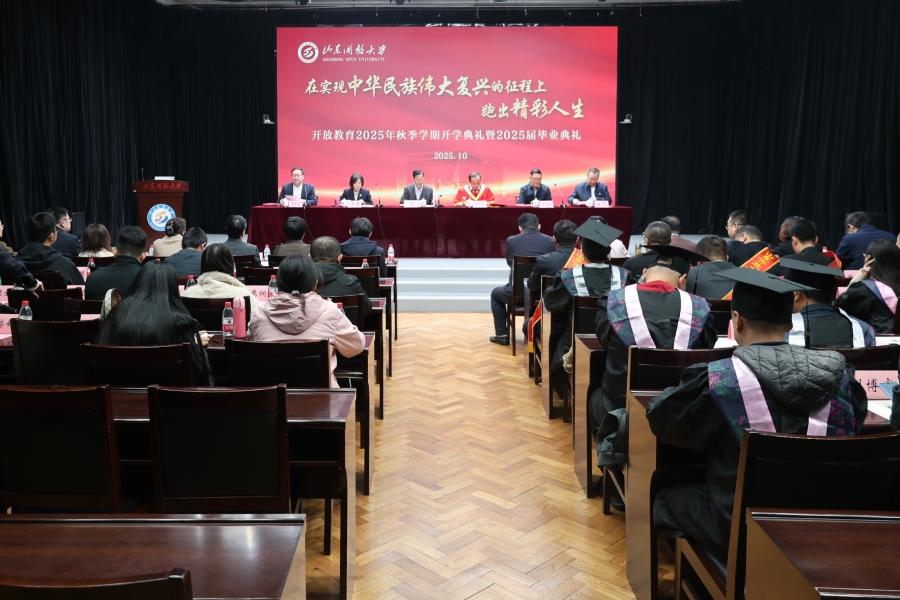 10月25日上午,学校开放教育2025年秋季学期开学典礼暨2025届毕业典礼在舜耕校区举行。学校党委书记徐文谋,党委副书记、校长司家军,党委副书记王瑛,党委委员、副校长吕文波,党委委员、副校长郭丕宽,党委委员、组织部部长程亮出席典礼。典礼由郭丕宽主持。