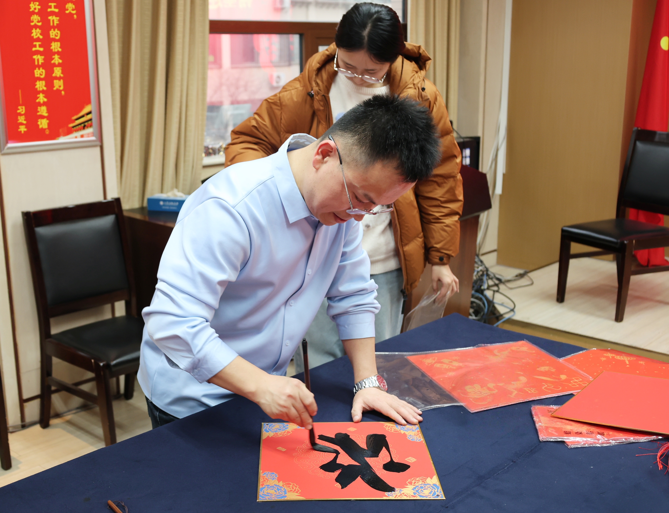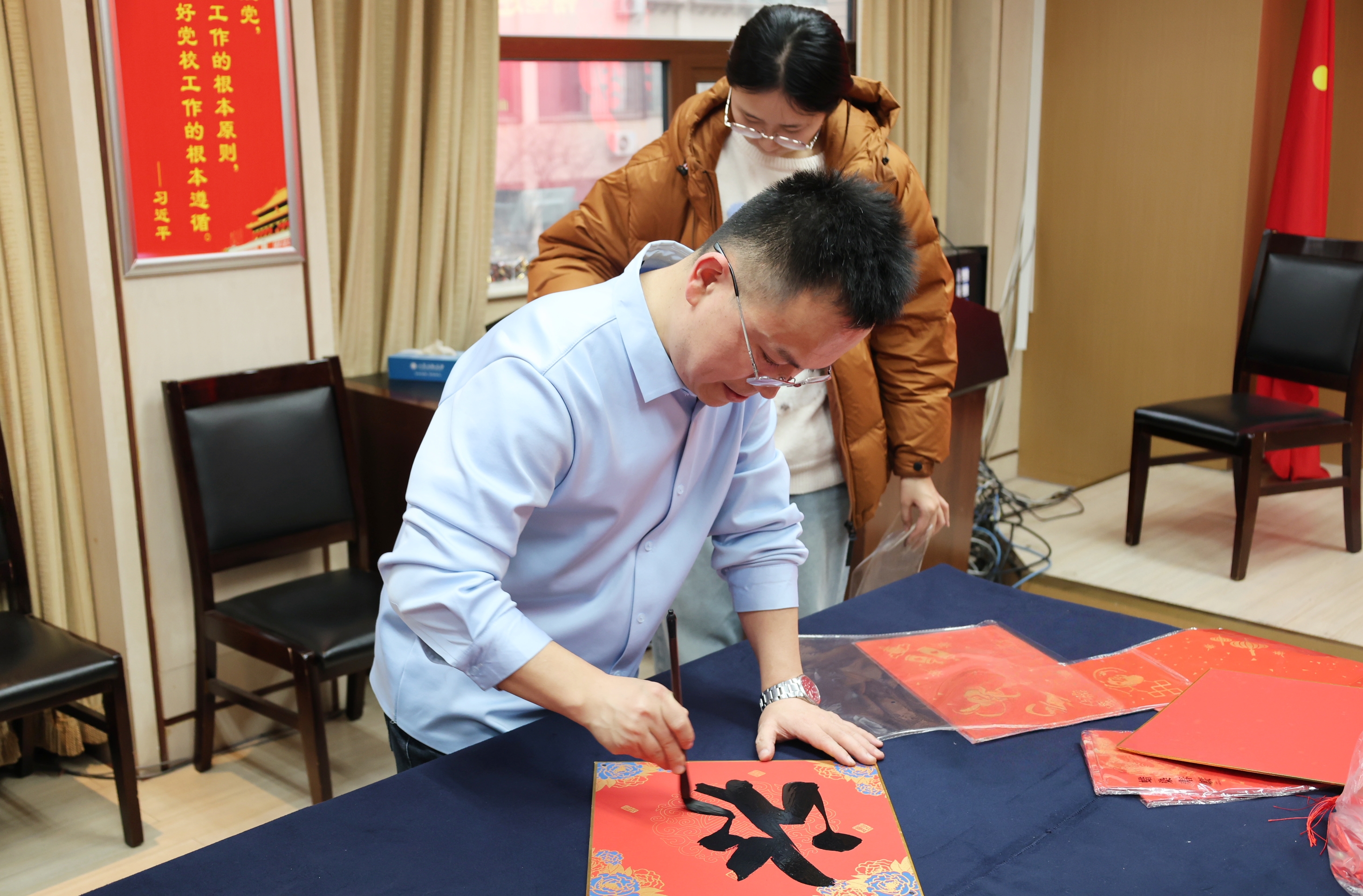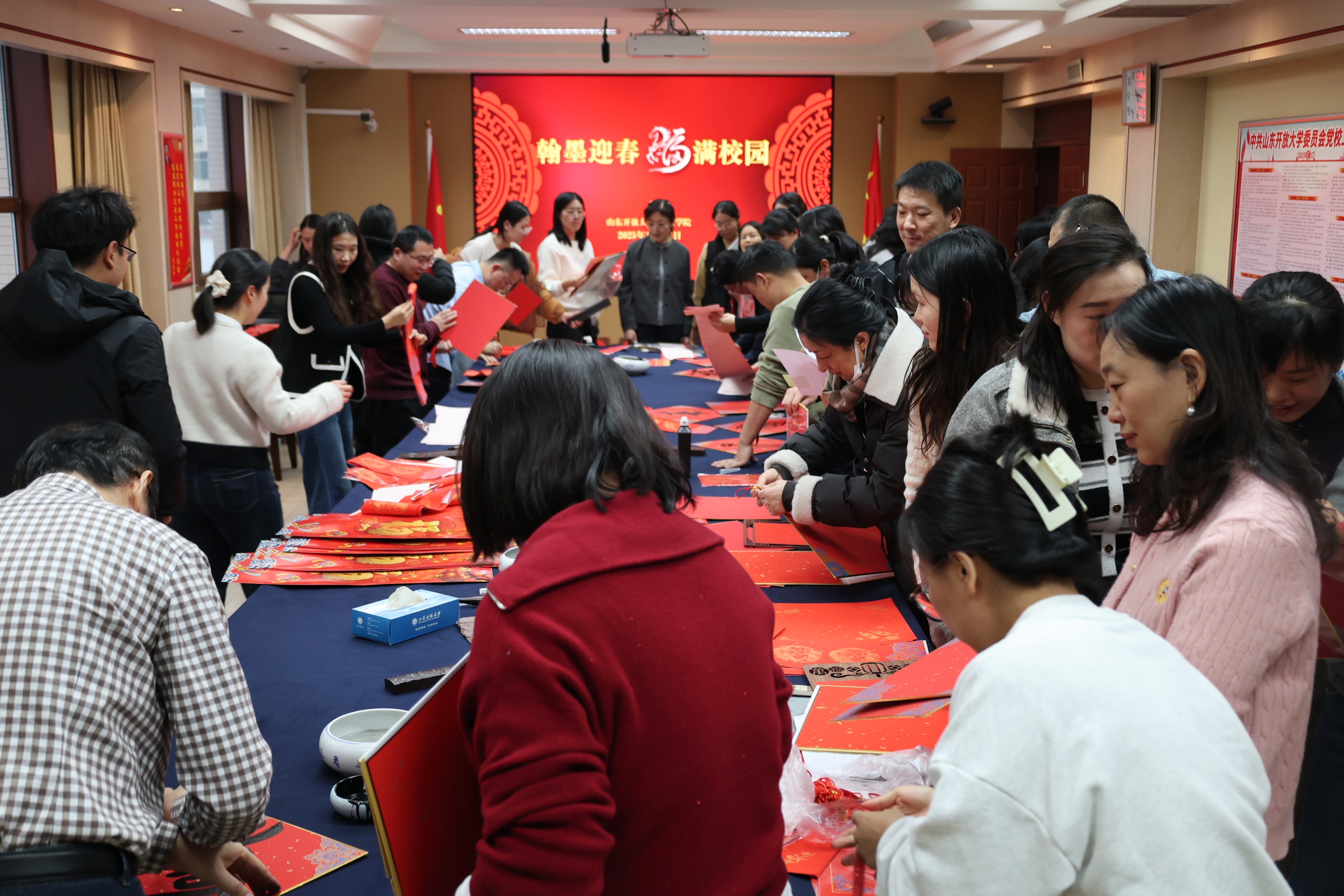 为弘扬中华优秀传统文化,厚植校园文化底蕴,营造喜庆祥和的新年氛围,12月22日下午,学校书法学院在千佛山校区二楼会议室举办“翰墨迎春 福满校园”主题活动。学校党委副书记、校长司家军,党委副书记王瑛,党委委员、副校长宁继红,党委委员、副校长吕文波等校领导与广大教职工齐聚一堂,挥毫送福、共迎新年。