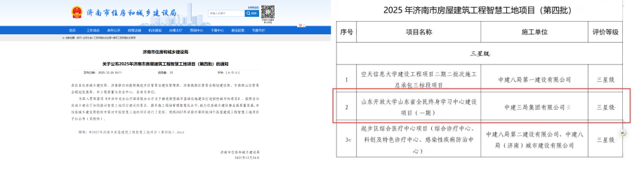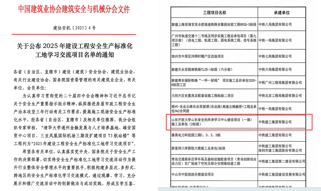 近日,山东省全民终身学习中心建设项目获得多项国家级及省市级工程奖项。其中,一标段工程入选济南市2025年房屋建筑工程智慧工地项目;二标段工程获得2025年全省住房城乡建设系统重点工程创新创优劳动竞赛奖项,成功入选2025年全国及山东省安全生产标准化工地学习交流项目。
