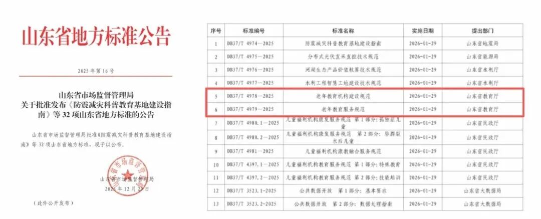12月29日,山东省市场监督管理局发布公告,正式批准发布《老年教育机构建设规范》《老年教育服务规范》两项山东省地方标准。这是我省首次针对老年教育领域制定的地方标准,我校作为主要起草单位之一,全程主导并深度参与了标准的调研、起草与论证工作,为标准的科学性与实用性提供了关键支撑。