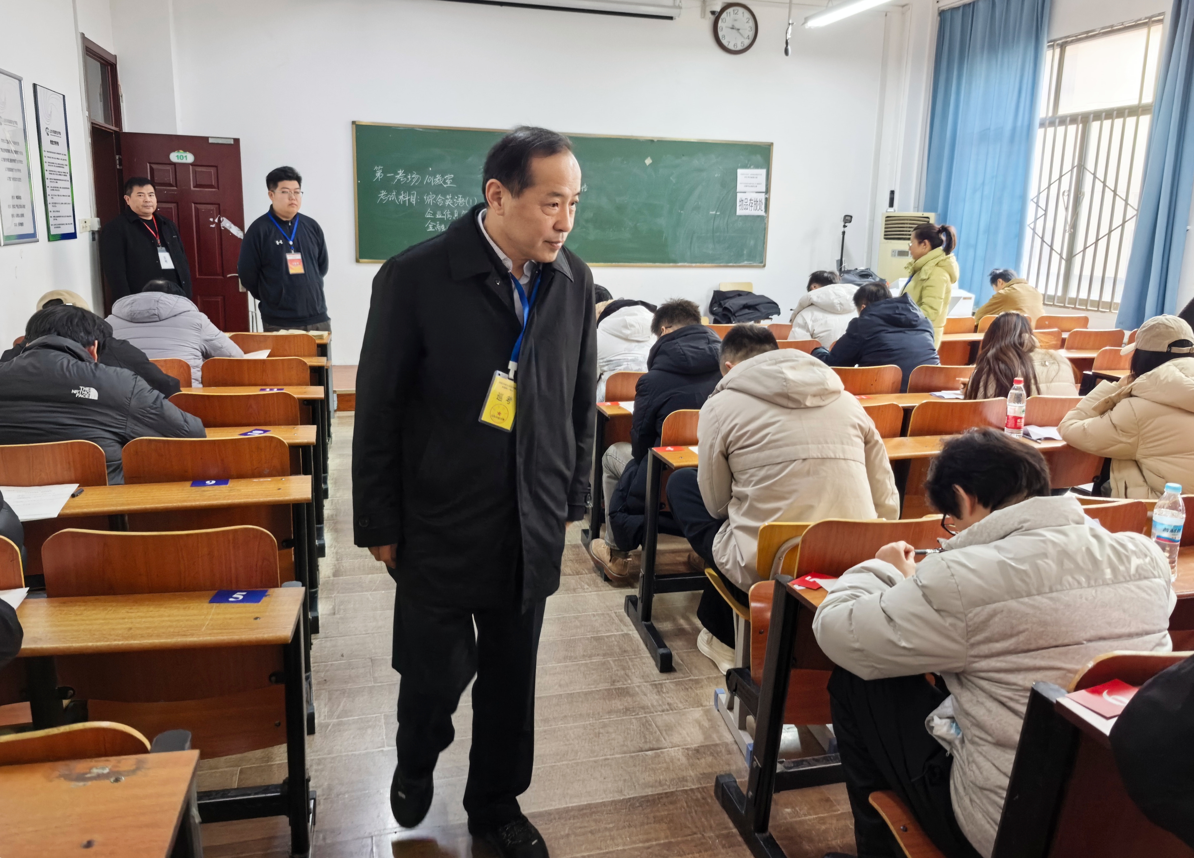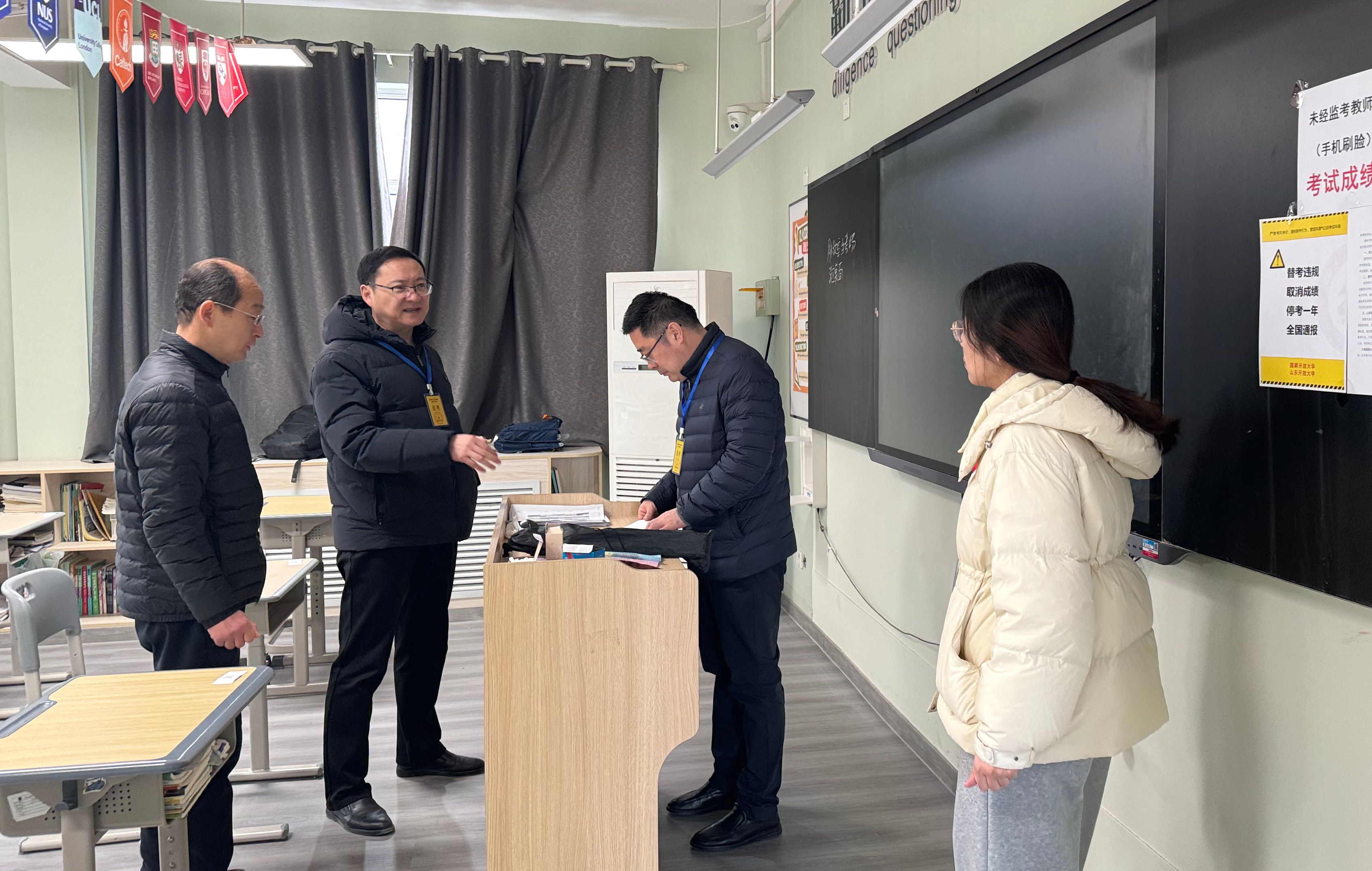 本次考试共涉及93295考次。为保障考试规范有序、公平公正,学校联合各市级开大组建94个蹲(巡)考组,实现全省考点巡考全覆盖。巡考人员不畏严寒、坚守岗位,重点对试卷保管、考场布置及工作人员履职等环节进行检查,并就考生服务保障、考务人员配置和应急处置等工作与考点主考进行沟通交流。通过全程监督考试组织流程与严格核查考风考纪执行情况,全体巡考人员为考试工作顺利推进筑牢安全保障防线。