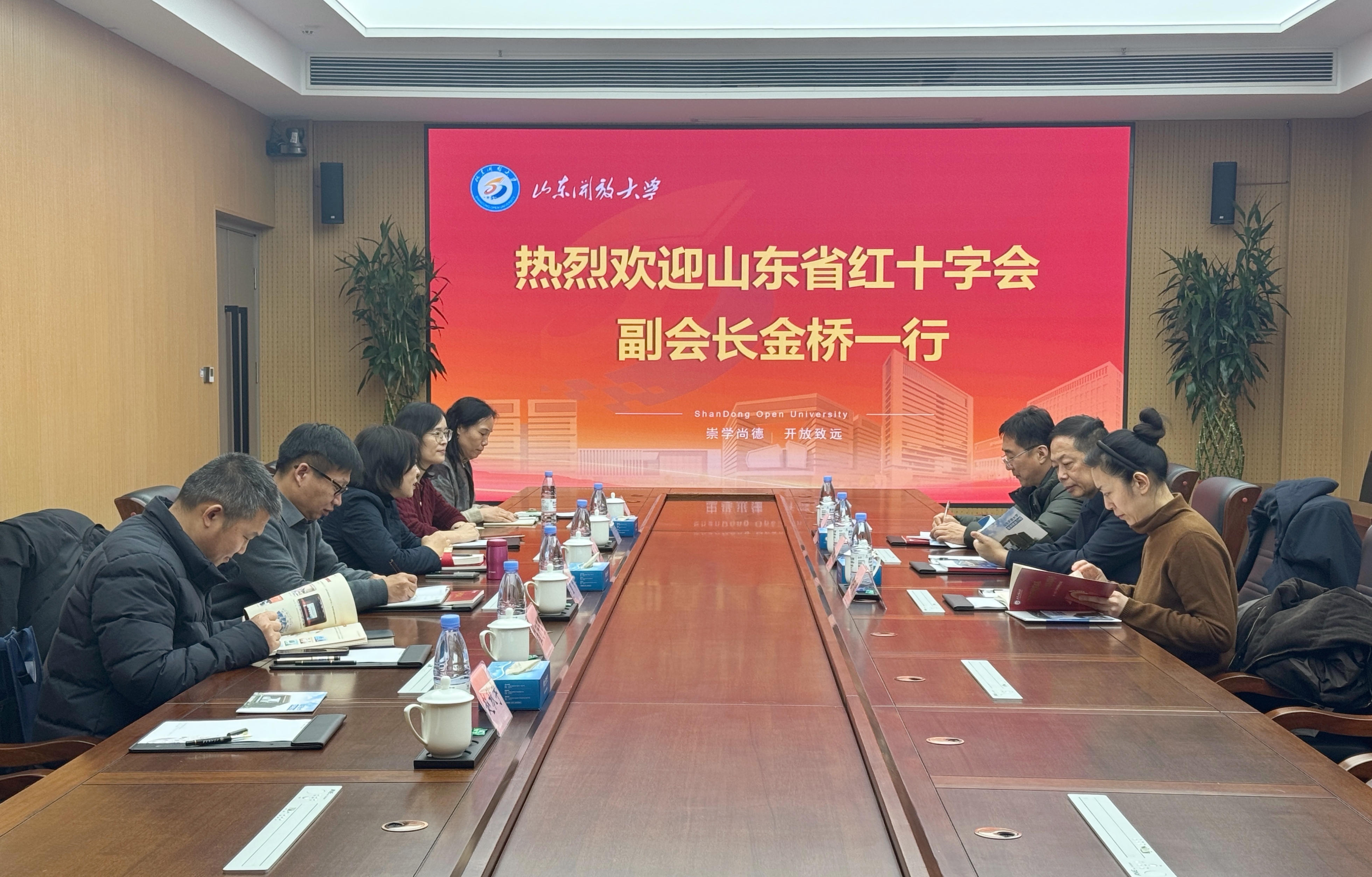 金桥对我校在特色教学、体系建设、服务全民终身学习等方面取得的成绩给予赞赏。他介绍了国际红十字会及中国红十字会的成立背景、历史与使命,详细阐述了红十字会在救灾救援、人道救助、正能量宣传及提高群众自救互救能力等方面的举措与成效。他表示,希望与山东开放大学深化协作、拓展渠道,推动红十字会精神直达基层。