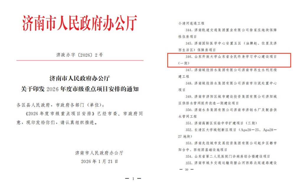 近日,济南市人民政府办公厅印发《2026年度市级重点项目安排的通知》(济政办字〔2026〕2号),山东开放大学山东省全民终身学习中心建设项目(一期)成功入选市级重点实施类项目,这是该项目自 2024 年以来连续第三次跻身济南市重点项目行列。