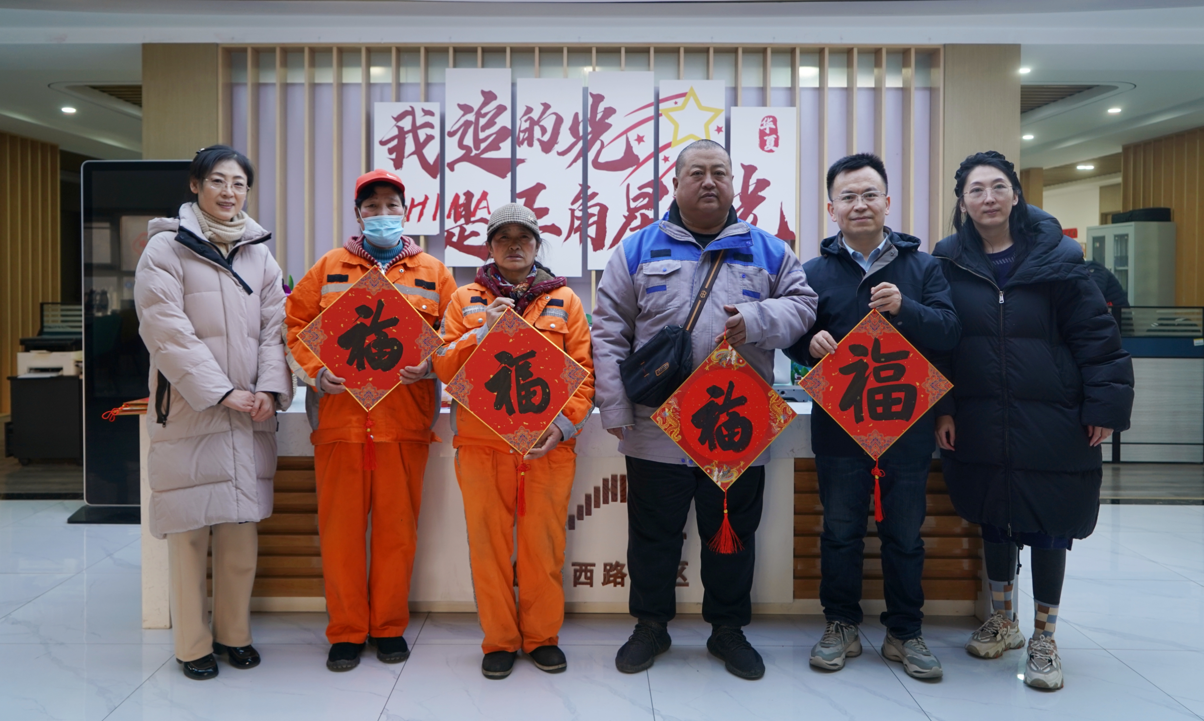 随后,学校代表与社区工作人员组成慰问小组,带着手写“福”字与春联,先后走访快递驿站与环卫工之家。在快递驿站,慰问小组将新春祝福送到忙碌的快递员手中,感谢他们风雨无阻、日夜奔波,为市民的日常生活提供便利;在环卫工之家,慰问小组与环卫工人亲切交谈,赞扬他们用辛勤的汗水守护城市整洁靓丽,并为他们送上新春问候。一线劳动者们接过饱含情谊的书法作品,纷纷表示深受感动,并对学校和社区的关怀表示衷心感谢。