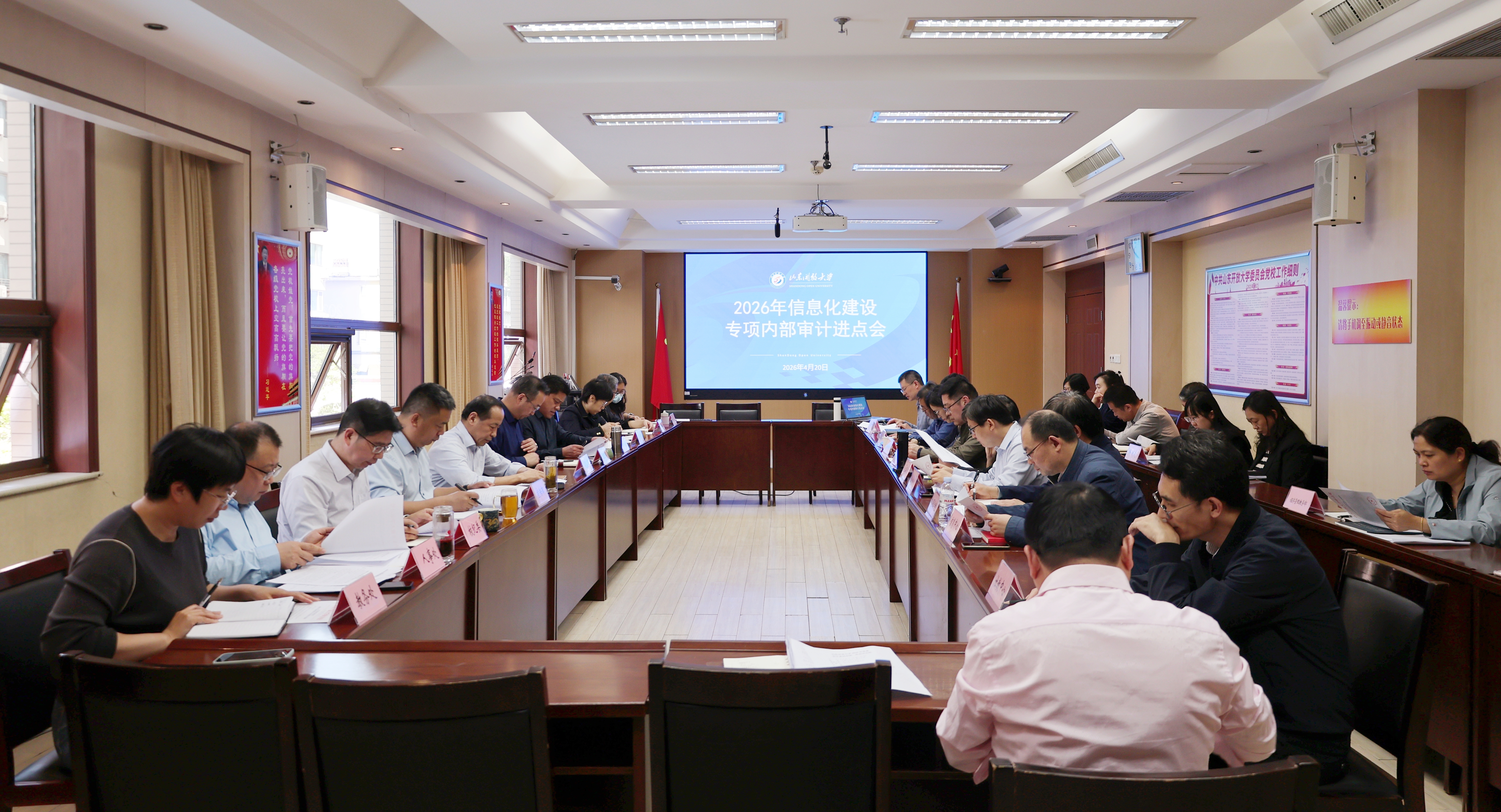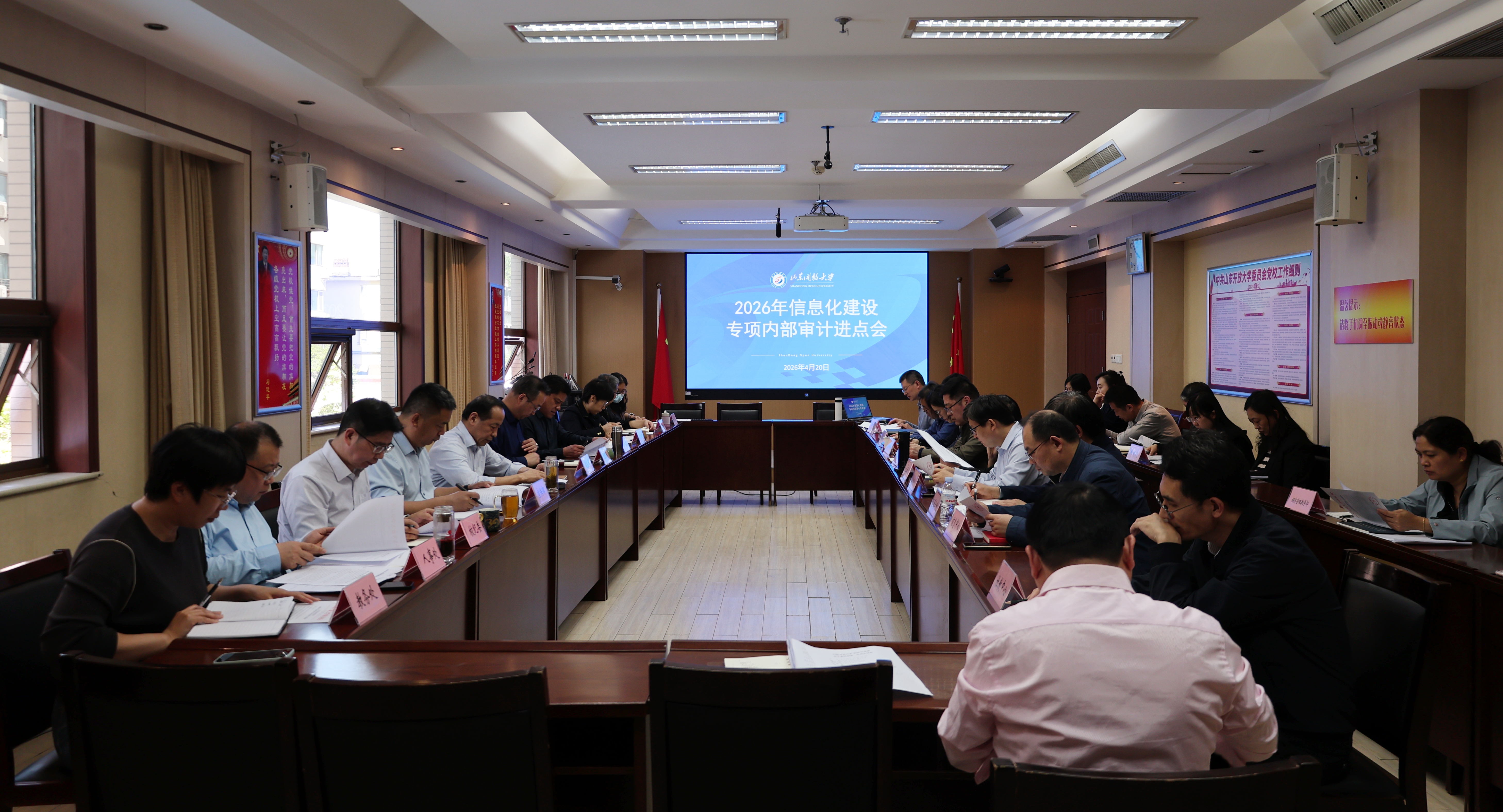 4月20日下午,学校在千佛山校区二楼会议室召开信息化建设专项内部审计进点会。学校党委副书记、校长司家军出席会议并讲话,各部门、单位主要负责人参加会议。