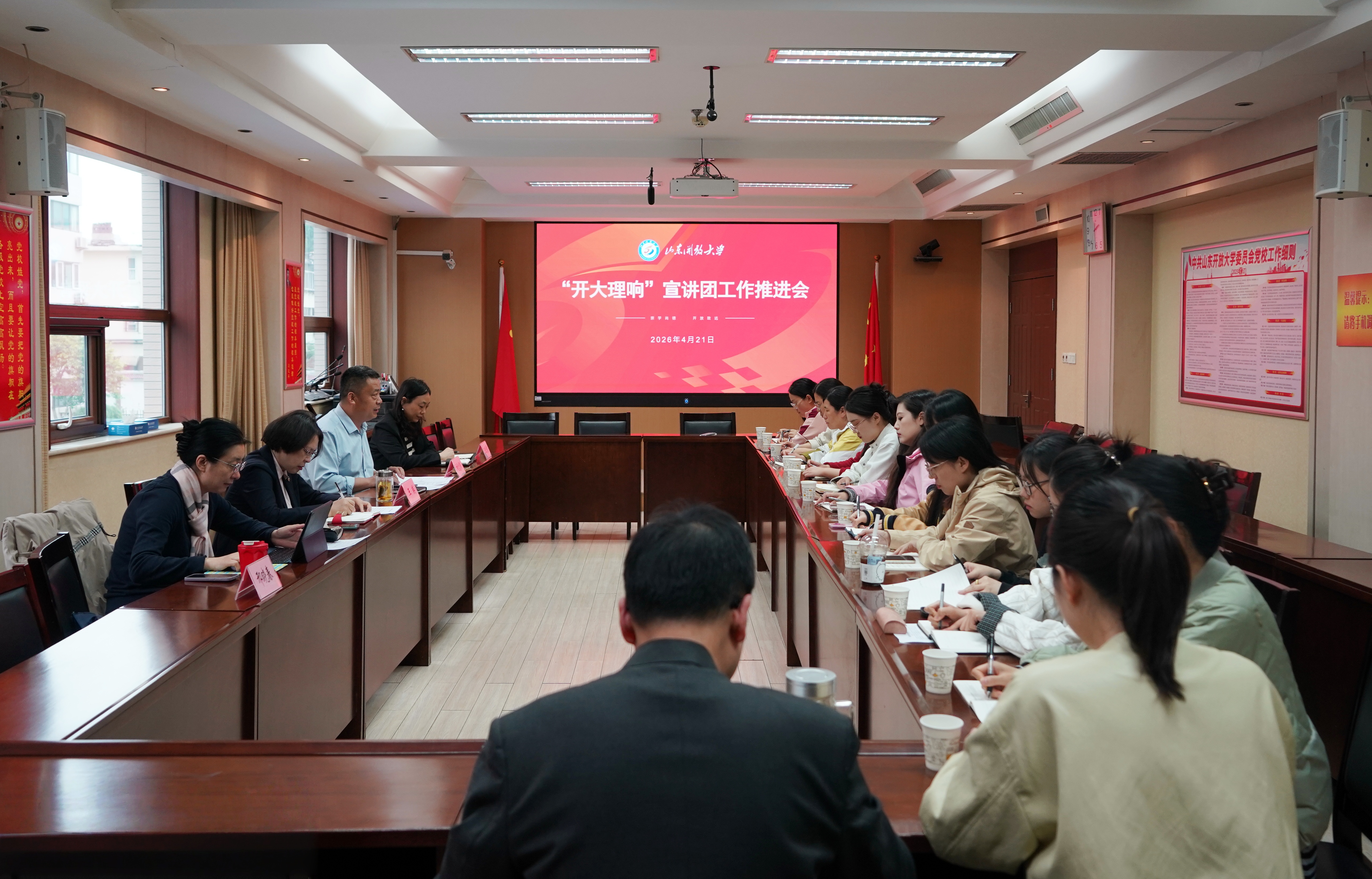 4月21日下午,学校在千佛山校区二楼会议室召开“开大理响”宣讲团工作推进会。学校党委副书记王瑛出席会议并讲话,党委委员、宣传部部长刘忠强主持会议,马克思主义学院负责人及宣讲团全体成员参加会议。